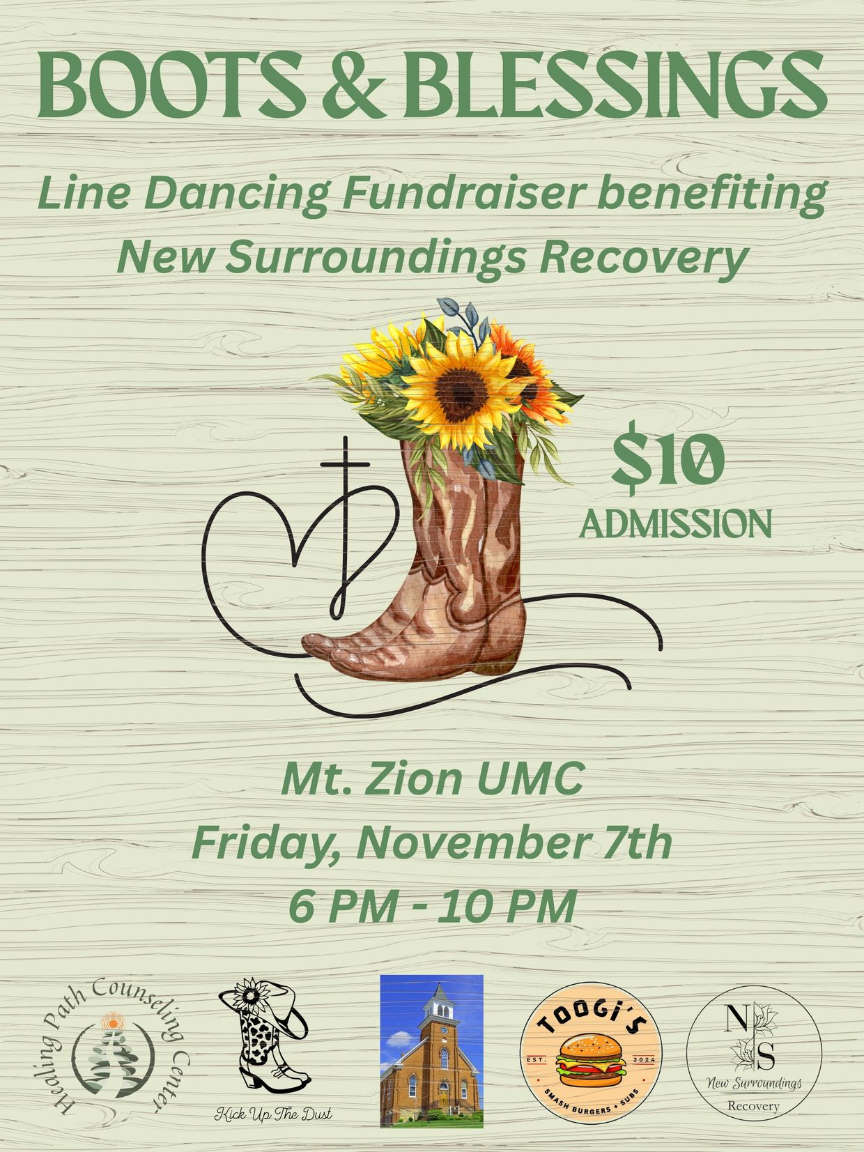 Join us at Mt. Zion UMC in Finksburg for Boots & Blessings, a Line Dancing Fundraiser benefiting New Surroundings Recovery, a non-profit sober living home for women in Woodbine, MD! 🌟